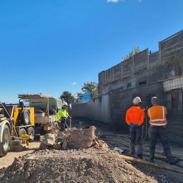 Accurate service trenches, kerb chase cuts and temporary retaining with shoring or battering—prepped and ready for pipework or walls.